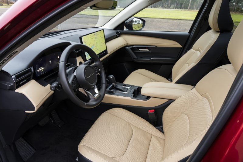 The all-new CX-5 is offered in four grades – Prime-Line, Centre-Line, Exclusive-Line, and Homura – each with distinct interior finishes and equipment. Interior options include black or tan leather (Homura) and a two-tone black-and-white artificial leather and suede-like finish (Exclusive-Line).