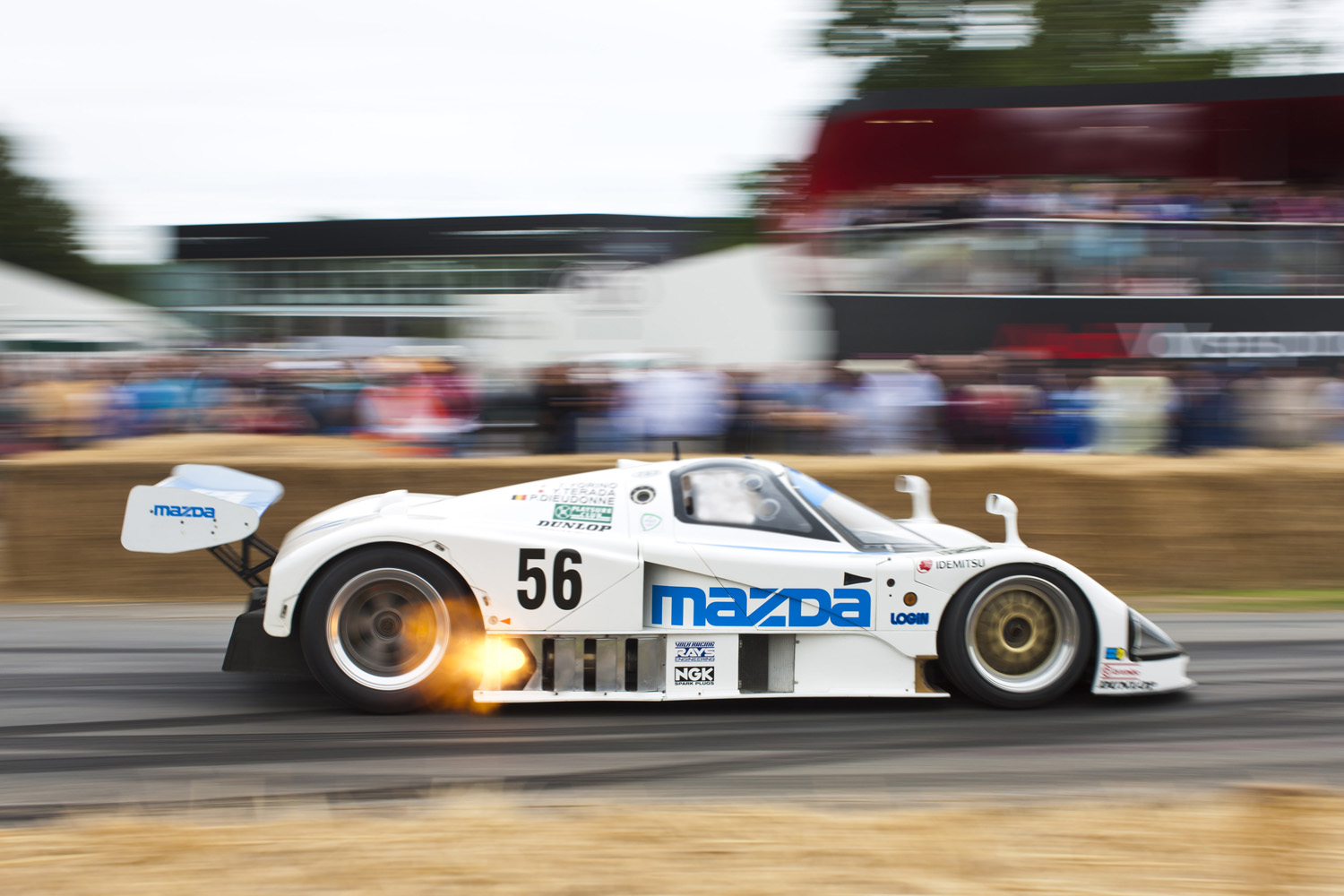 The Mazda 787 rounds the first corner of the Hillclimb course at the 2015 Goodwood Festival of Speed