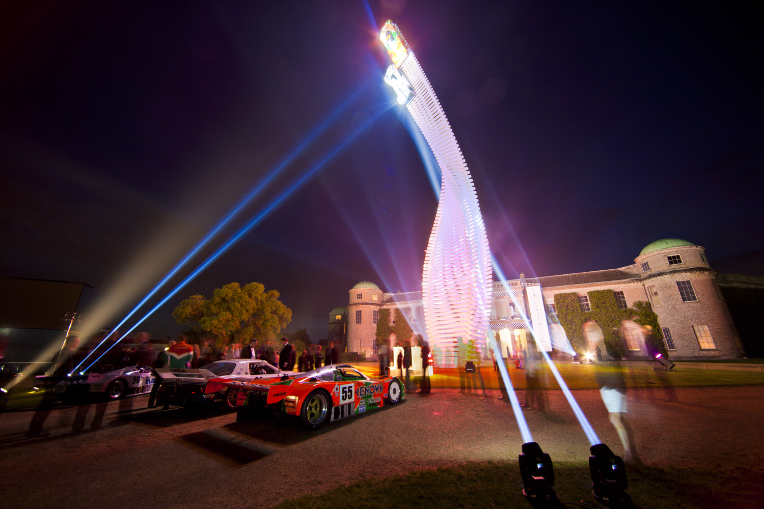 Spotlights illuminate the stars of the 2015 Central Sculpture, the Mazda 787B and LM55 Vision Gran Turismo concept