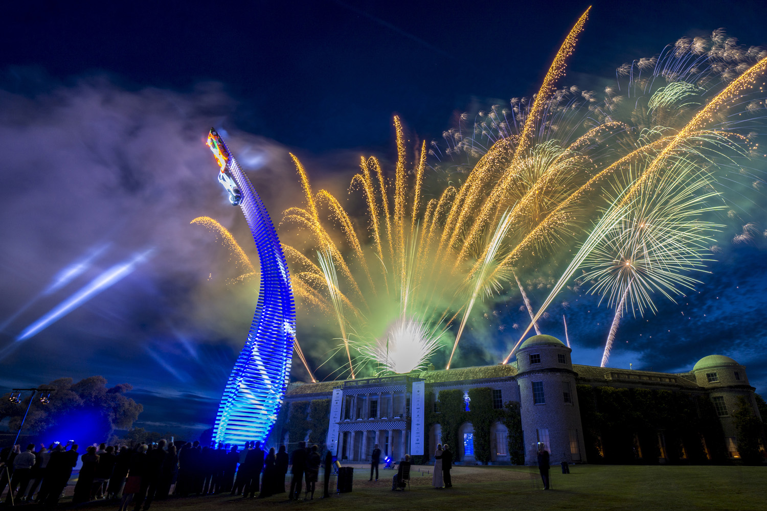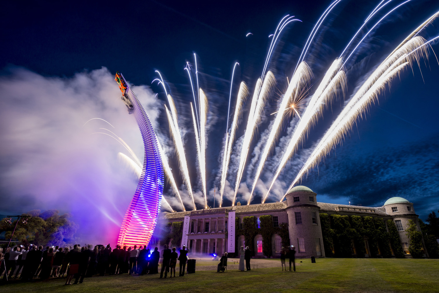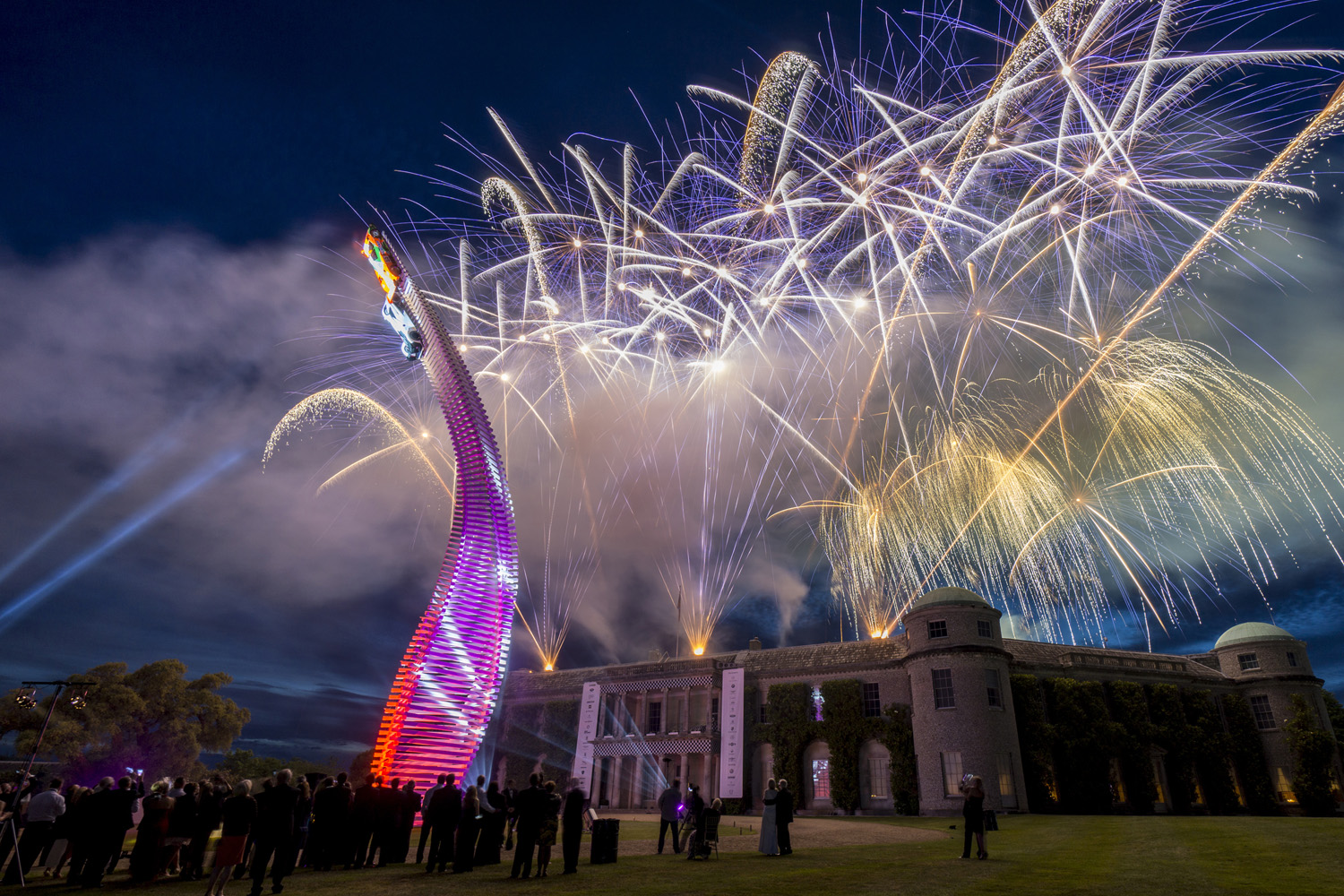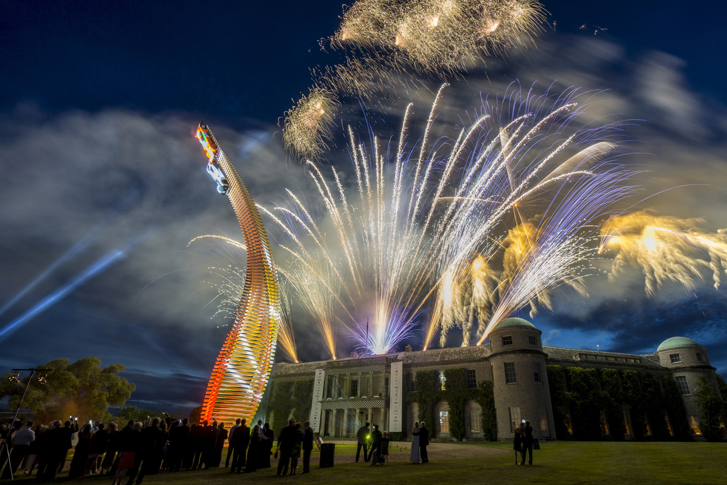 Fireworks light up the night behind the stunning Gerry Judah-designed Central Sculpture celebrating Mazda's motorsport heritage
